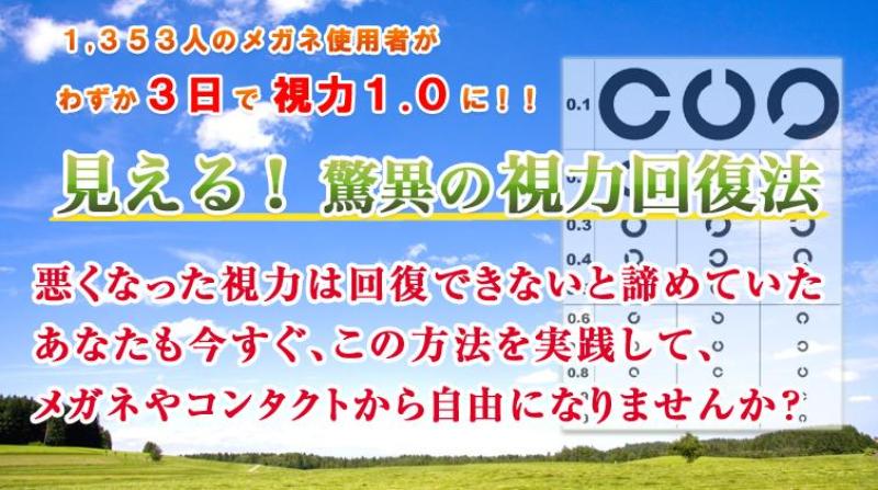 ⇒特典付き「1,353人のメガネ使用者がわずか3日で視力が1.0に!!見える!驚異の視力回復法」の詳細はこちら!