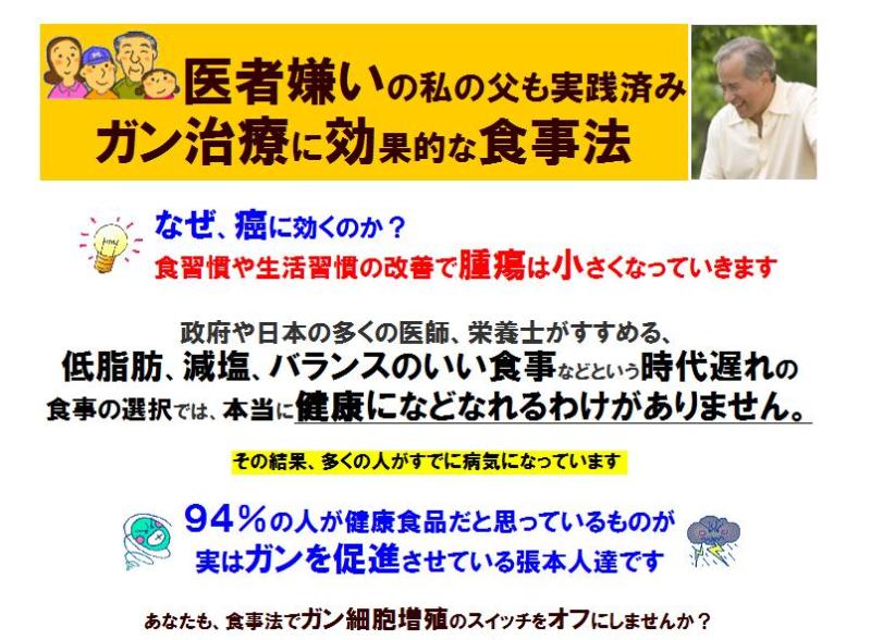 ⇒特典付き「≪癌≫医者嫌いの私の父も実践済ガン治療に効果的な食事法」の詳細はこちら!