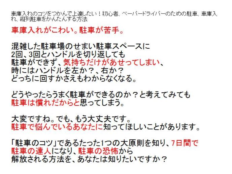 車庫入れのコツをつかんで上達したい!初心者、ペーパードライバーのための駐車、車庫入れ、縦列駐車をかんたんする方法!かんたん駐車マニュアル