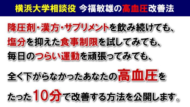 今後は、高血圧の根本的原因を理解した上で、正しい改善法に取り組んでください。今福式の中身を少しだけ紹介。では、ここからは今福式高血圧改善プログラムについて、具体的にどんな内容なのか、少しだけ紹介していきます!今福敏雄の高血圧改善法