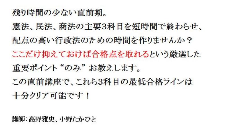 残り時間の少ない直前期。憲法、民法、商法の主要3科目を短時間で終わらせ、配点の高い行政法のための時間を作りませんか?ここだけ抑えておけば合格点を取れるという厳選した重要ポイント “のみ” お教えします!行政書士直前対策講座
